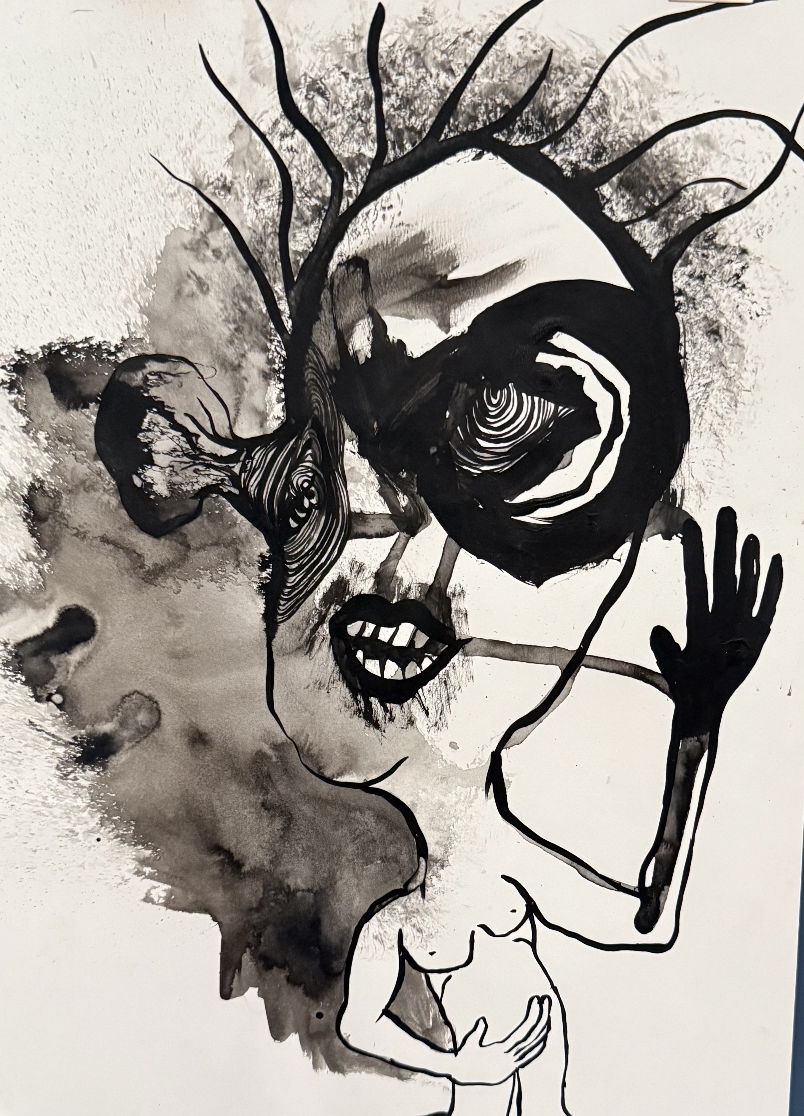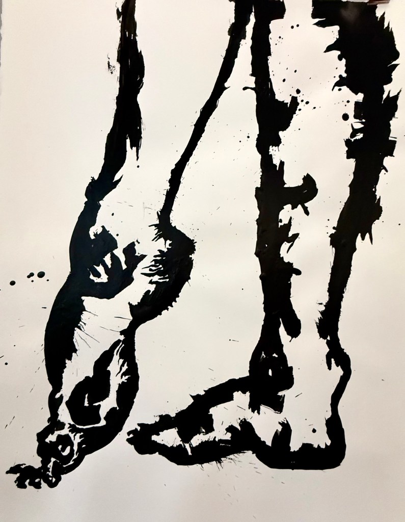 Ces dessins qu’il décline dans différentes dimensions, de la feuille A4 à des tailles excédant deux ou trois mètres de haut, prennent une force et une présence particulière quand il occupent de grands murs, affirmant une présence remarquable, puissante.