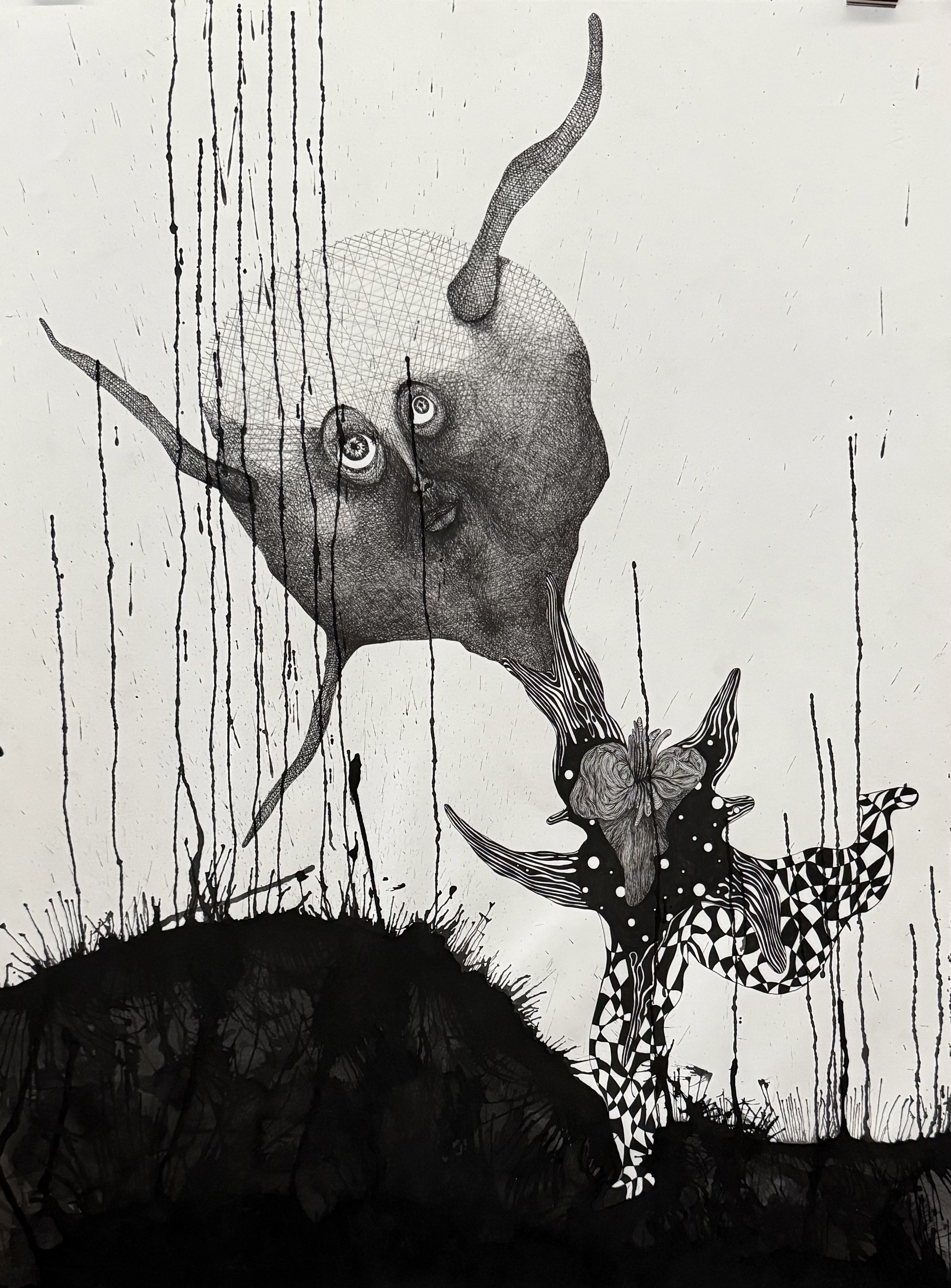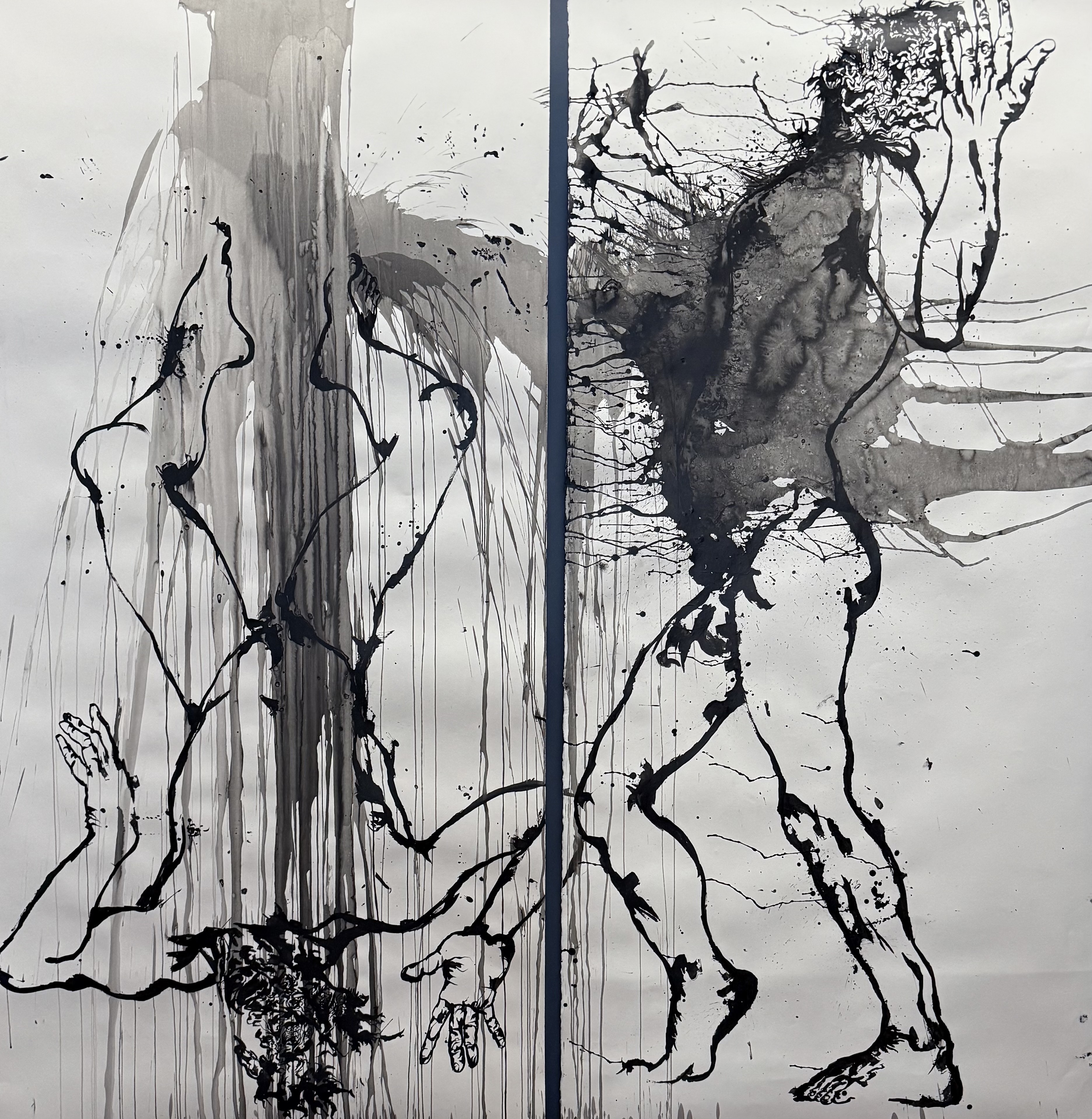 A partir d’autoportraits photographiques, Frédéric Fenoll peint à l’encre noire de grandes formes anthropomorphes qu’il éclabousse de taches d’encre noire ou de coulures plus ou moins maîtrisées qui les recouvrent en partie.